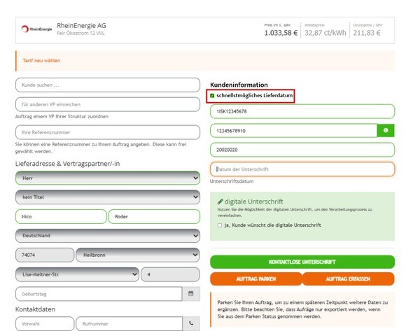 - Damit eine Kündigung beim derzeitigen Lieferanten erfolgen kann, müssen alle Kundenangaben mit den derzeitigen Daten übereinstimmen (Datenänderungen können erst im Nachhinein durch den Kunden beim Kundenservice vorgenommen werden)