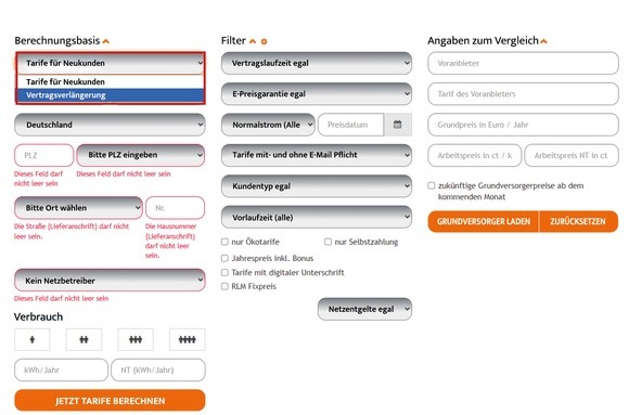 Wichtig: Für Neukundenfälle (Einzug oder Wechsel) bleibt alles wie gewohnt – der Tarifrechner ist so konfiguriert, dass keine Auswahl im Dropdown erforderlich ist.